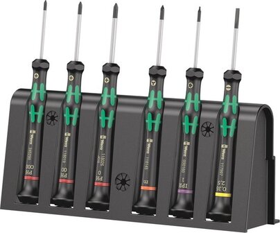 High quality Wera Micro screwdriver set for precision mechanical work. Rapid twisting is possible by fixing the hand on the twist cap and using the fast-turning zone just below it. This makes time-consuming grip adjustments unnecessary. Power zone with integrated soft zones ensure the transfer of higher tightening and loosening torque. Precision zone for the right angle for adjustment work. The Wera Black Point tip offers high corrosion protection and an exact fit. Includes practical rack for tidy storage of the screwdrivers.