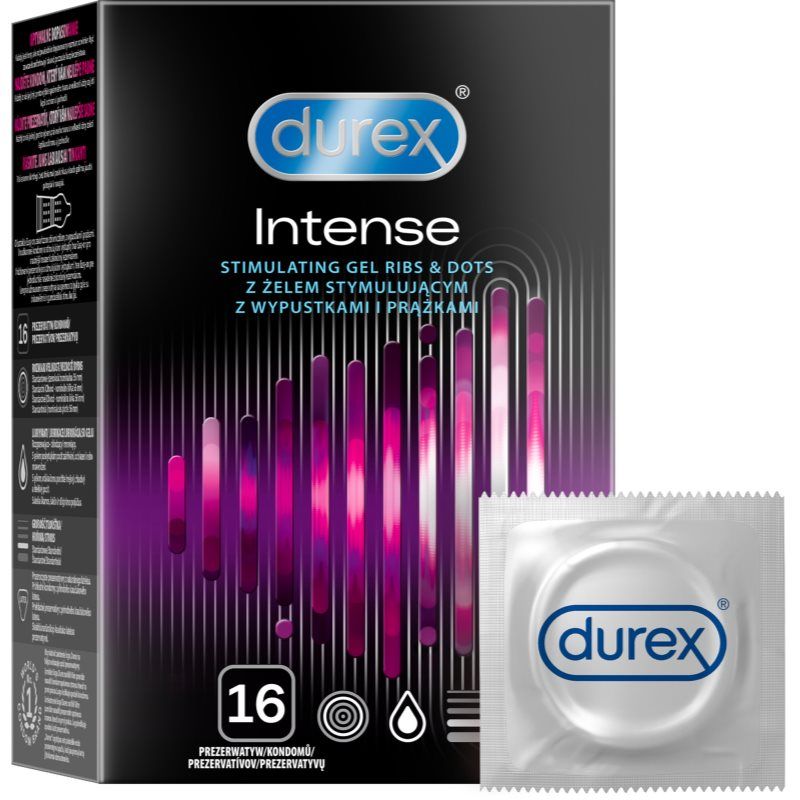 Durex Intense, 16 st, Condooms voor Mannen, Voor maximaal genot zonder risico‘s. Condooms Durex Intense bieden je betrouwbare bescherming zodat je zorgeloos van intieme momenten kunt genieten. Kenmerken: kan snel en eenvoudig gebruikt worden van doorzichtig latex dunner materiaal voor betere gevoeligheid met ribbels voor maximaal genot transparant voorbehoedsmiddel parfumvrij, smaakloos voorbehoedsmiddel zo dun dat je het condoom bijna niet voelt met nopjes voor extra stimulatie met reservoir Ingrediënten: natuurlijk latex van de rubberboom Hoe te gebruiken: Volg de gebruiksaanwijzing. Gebruik een glijmiddel op waterbasis.