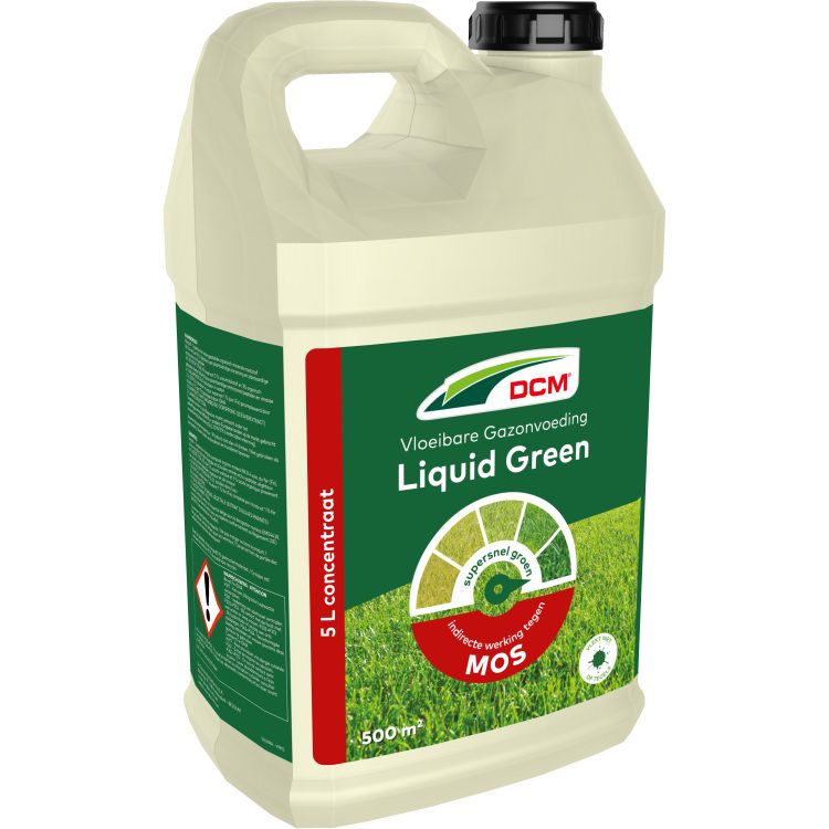 Een lange winter, een droge zomer, een stevige verticuteerbeurt: elk gazon heeft wel eens een dip. Maar wat als het een keer snel moet gaan, omdat je net een groots tuinfeest of een prachtige familiebarbecue hebt gepland? Geen stress! Vloeibare gazonvoeding zoals de DCM Vloeibare Gazonvoeding Liquid Green 5 L verpakking biedt dé oplossing voor een acuut gazonprobleem. Vloeibare gazonmeststoffen vormen het extraatje dat elk gazon wel eens kan gebruiken. Wanneer je gazon door omstandigheden tijdelijk in een dip zit, en je je groene grasmat graag snel terug wil. Omdat er net op dat moment een feestelijkheid in je tuin op het programma staat, bijvoorbeeld. Ook als het relatief droog is en niet ideaal om meststofkorrels te strooien, want je hoeft immers niet te wachten op een regenbui of extra te beregenen want de voeding wordt direct via het blad en de wortels opgenomen. DCM Vloeibare Gazonvoeding Liquid Green geeft het gazon een snelle boost en biedt dé oplossing voor een acuut voedingstekort. Binnen 24 uur zie je al resultaat! Vloeibare gazonvoeding vormt niet alleen een geweldige opkikker voor je grasmat, in een gezonde, dichte grasmat maakt mos minder kans om zich te ontwikkelen. Na de sproeibeurt met de vloeibare voeding verkleurt het mos geleidelijk aan geel, en kun je het twee weken later al uitkammen of verticuteren. Van een supersnelle en efficiënte oplossing gesproken. Ook prettig: vloeibare gazonvoeding maakt geen vlekken op stenen of paden.