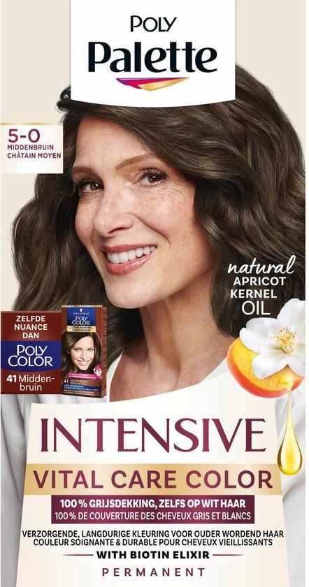 Poly Palette (voorheen Poly Color) heeft nu een verbeterde verzorgende formule en kleurresultaat. Palette Vital Care Color haarkleuring bevat kleurpigmenten die tot diep in de haarvezels doordringen voor een intens en natuurlijk uitziend kleurresultaat tot wel 8 weken. Deze haarkleuring garandeert 100% grijsdekking op alle haarkleuren. Het bijgevoegde verzorgende haarmasker is verrijkt met natuurlijk abrikozenpitolie en biotine-elixer. Het masker heeft daardoor een anti-breuk effect en geeft versterking aan het haar voor een glanzend en natuurlijk kleurresultaat!
