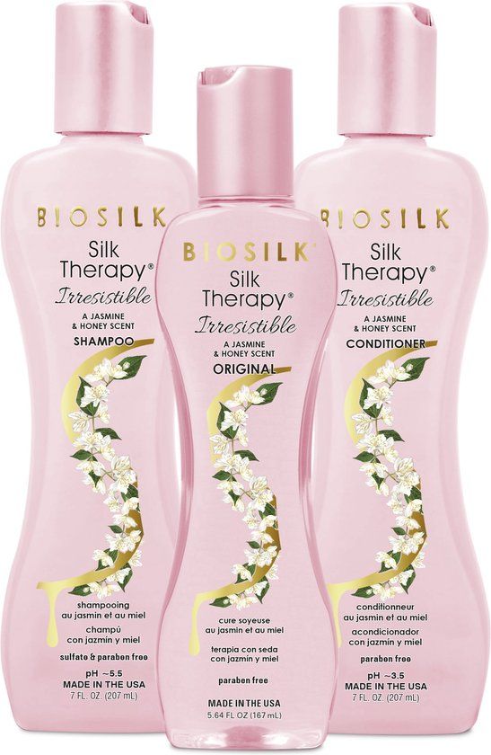 BioSilk Silk Therapy Irresistible - Trio KitEen set die het haar versterkt, hydrateert, beschermt en zorgt voor een ongelooflijke glans met de geur van Jasmijn en Honing.BioSilk Silk Therapy Irresistible Trio Kit bevat shampoo, conditioner en leave-in treatment met de heerlijke geur van jasmijn en honing, waardoor je haar onweerstaanbaar wordt! De Irresistible Silk Therapy collectie zal je schoonheid van binnen en van buiten doen ontwaken en je haar voorzien van de essentiële ingrediënten om het vocht in alle haartypes en texturen aan te vullen.