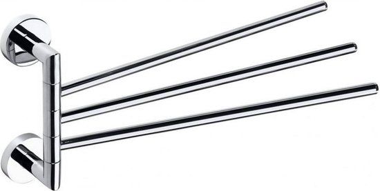 Drievoudige Handdoekhouder Sapho X-Round Draaibaar 45 cm Chroom, Deze handdoekhouder is van het merk Sapho en behoort tot de accessoires-serie X-Round. De handdoekhouder heeft een lengte van 45 cm, een hoogte van 19.5 cm en een diepte van 5.5 cm. Het product is gemaakt van verchroomd messing en afgewerkt in een chromen kleur. Het betreft een handdoekhouder die aan de muur bevestigd moet worden. Een draaibare handdoekhouder neemt nauwelijks ruimte in beslag, maar u kunt er wel twee handdoeken op kwijt. Ideaal naast uw badkamermeubel. Bij deze handdoekhouder kunnen de drie stangen 180 graden los van elkaar gedraaid worden. Mooi en makkelijk. Wij adviseren niet in de voeg van de tegel te boren. De accessoire heeft dan niet genoeg houvast om recht te blijven hangen. Voor een stevige montage is het dus beter om in de tegel te boren. Om te voorkomen dat de boor uitschiet, kunt u eerst wat tape op de tegel plakken. Specificaties Drievoudige Handdoekhouder Draaibaar 45 cm Chroom Sapho X-Round: - Merk: Sapho, - Serie: X-Round, - Materiaal: Verchroomd messing, - Kleur: Chroom, - Lengte: 45 cm, - Hoogte: 19.5 cm, - Diepte: 5.5 cm, - Installatie: Boren, - Draaibaar: Ja, - Geschikt voor 3 handdoeken, - Fabrieksgarantie: 10 jaar