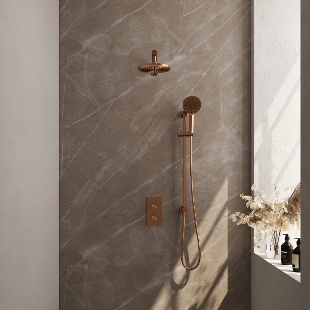 Brauer Copper Carving thermostatische inbouw regendoucheset met 2-weg omstel 40cm rechte wandarm met 20cm ronde hoofddouche 3 standen ronde handdouche 150cm gladde doucheslang met glijstang en handdouchehouder Koper geborsteld PVD 5-GK-139 - Handdouchekoppen