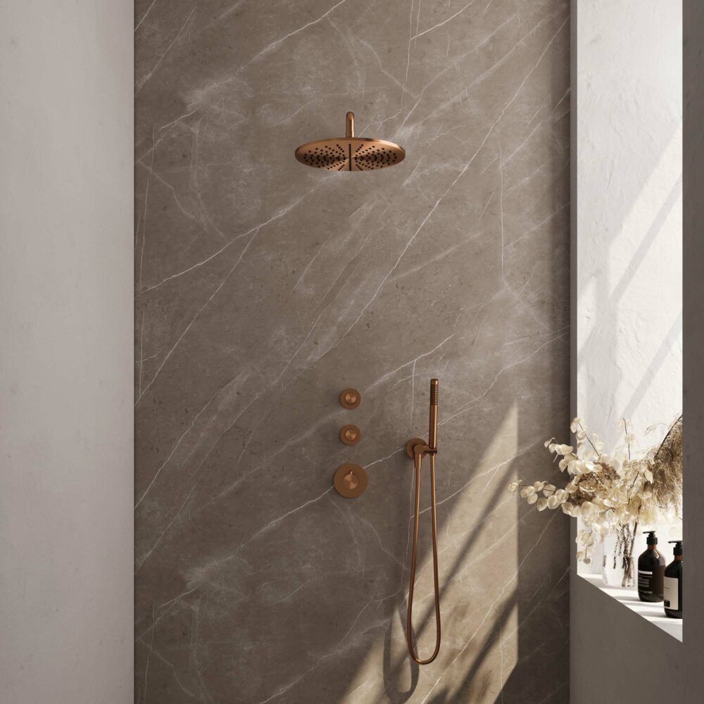 Brauer Copper Carving thermostatische inbouw regendoucheset 40cm gebogen wandarm met 30cm ronde hoofddouche 1 stand staafhanddouche 150cm gladde doucheslang met aansluitbocht en handdouchehouder Koper geborsteld PVD 5-GK-100 - Handdouchekoppen