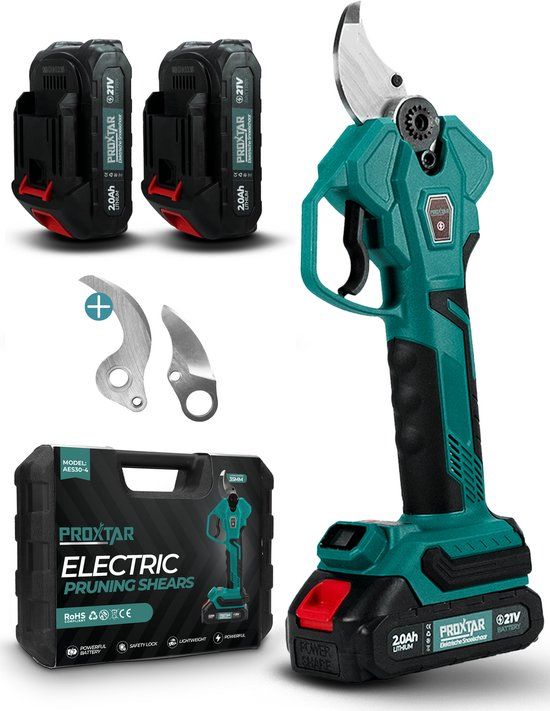 ProXtar Elektrische Snoeischaar - 35mm Snijdiameter - Takkenschaar - Accu Snoeischaar - Heggenschaar - Inclusief Opberkoffer, 2 Accu's & Reserve Set Snoeimessen - Heggenschaar