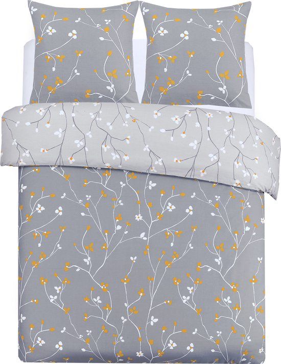 Vision Freya Dekbedovertrek - 260x240cm - Katoen - Grijs/Wit/Oranje - Gebloemd - Hoezen voor donsdekens