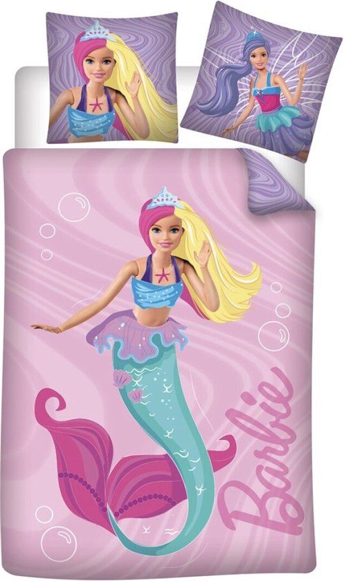 Barbie Dekbedovertrek Zeemeermin. Mooi en kleurrijk dekbedovertrek van Barbie als zeemeermin. Ben jij ook zo'n fan van Barbie en gek op mermaids? Dan sla je met dit dekbedovertrek twee vliegen in één klap! Een te gekke blikvanger voor elke kinderkamer! Het katoenen dekbedovertrek en kussensloop hebben een dubbelzijdige bedrukking, wat leuke mogelijkheden geeft bij het opmaken van het bed. Een waanzinnig leuk cadeau om te geven aan de Barbie fan voor een verjaardag of de feestdagen.