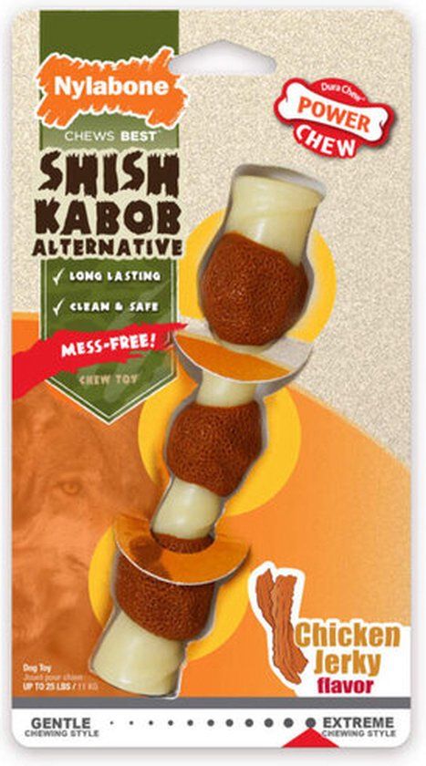 Geïnspireerd door de natuur, is de Power Chew Shish Kebab Alternatief sterk gebouwd en bevredigt het natuurlijke kauwinstinct van uw hond! Deze shish kebab-kluif voor honden is ontworpen om eruit te zien en aan te voelen als een echte kebab zonder vlekken, geuren, vet of rommel. U zult het heerlijk vinden om uw hond de hele tijd te trakteren op de hartige schokkerige smaak van kip - zonder calorieën! Ons kauwspeelgoed is van duurzaam nylon gemaakt en is bestand tegen krachtige kauwers, ontmoedigt destructief kauwen en houdt honden bezig voor langdurig entertainment. Dit kleine hondenkauwspeeltje is bedoeld voor honden tot 23 kilo.