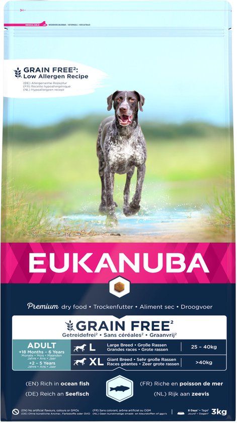 Een 100% gebalanceerd en graanvrij recept voor je viervoeter, dat is Eukanuba Grain Free Adult. Deze brok is geschikt voor volwassen honden van grote rassen (van 10 tot 25 kg) óf voor zeer grote rassen (vanaf 40 kg).