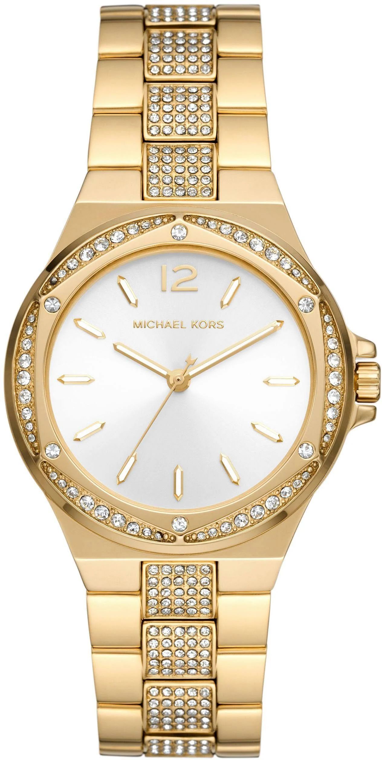 Dit 37 mm Michael Kors Lennox horloge heeft een witte sunray wijzerplaat, een uurwerk met drie wijzers en een goudkleurige horlogeband van roestvrij staal met steentjes op de middelste schakels. Een update van het luxueuze horloge platform van Michael Kors: Lennox. Deze stijl heeft een unieke gefacetteerde topring met glitter details op de band. Het horloge is waterbestendig tot 5 ATM en is dus geschikt om mee te douchen.Michael KorsMichael Kors is de toonaangevende modeontwerper voor luxe accessoires en sportkleding. Of het nu Aspen, Palm Beach, Parijs of Capri is, Michael Kors brengt het gevoel van een luxe jetset-levensstijl naar mensen over de hele wereld. Michael Kors horloges en sieraden zijn de perfecte mix van vorm en functie. Of het nu gaat om een moderne draai aan een klassiek idee of mooie gemengde materialen, elk ontwerp belichaamt Michaels filosofie van chic, luxueus design.