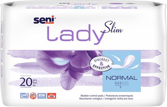 Seni lady Slim Normal: Dit product is geschikt voor vrouwen die af en toe urineverlies ervaren bij lichte tot matige incontinentieproblemen. Formaat 10,5 x 28cm, inhoud verpakking is 20 stuks.
