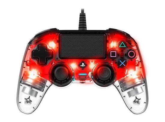 Wil je lekker kunnen gamen zonder dat je je zorgen hoeft te maken over een lege batterij? Dan is deze officieel gelicenseerde Illuminated Wired Compact Controller van Nacon voor je PlayStation 4 een prima keuze! Je sluit de bedrade controller in een mum van tijd op je PS4 aan en voor je het weet zit je helemaal midden in je game.\n\nDe controller is niet alleen goedkoper dan andere officieel gelicenseerde controllers voor de PlayStation 4, maar ook nog eens compacter. Zo ligt de controller door zijn ergonomische vorm lekker in de hand tijdens het gamen en zorgen de verschillende functionaliteiten voor optimaal gameplezier. Ook voor jongere gamers is de Illuminated Wired Compact Controller van Nacon een ideale controller om het gamen onder de knie te krijgen.\n\nCompacte en aantrekkelijk geprijsde PS4 controller\nDe Illuminated Wired Compact Controller van Nacon is misschien kleiner van formaat, maar z’n functionaliteiten zijn dat zeker niet! De controller heeft een touchpad, een 3,5mm stereo-headsetaansluiting en trilmotoren, waardoor je optimaal in je game zit. Het snoer van maar liefst 3 meter zorgt ervoor dat je tijdens het gamen alle vrijheid hebt die je je maar wensen kan. Deze compacte PS4 controller van Nacon ziet er bovendien supervet uit! De transparante behuizing wordt verlicht door rode LED-lampjes. En dat geeft deze Nacon controller een wel heel flitsend uiterlijk.\n\nIlluminated Wired Compact Controller met vertrouwde knoppen\nDe Illuminated Wired Compact Controller voor de PS4 van Nacon beschikt over alle knoppen die je als gamer zo gewend bent op je PlayStation 4. De analoge sticks, Share-, Options- en PS-knoppen: ze zijn allemaal aanwezig op deze stoere PlayStation 4 controller van Nacon.\n\nKies je liever voor een PS4 controller met een draadje in plaats van een draadloos exemplaar en wil je niet te veel betalen voor jouw exemplaar? Dan is deze rode, officieel gelicenseerde Illuminated Wired Compact Controller van Nacon met een zeer goede prijs/kwaliteitverhouding precies wat jij zoekt.