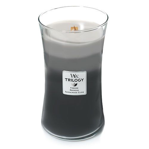 WoodWick Hourglass Large Trilogy Warm Woods Geurkaars - Amber, Muskus, Vetiver - Zwart/Grijs