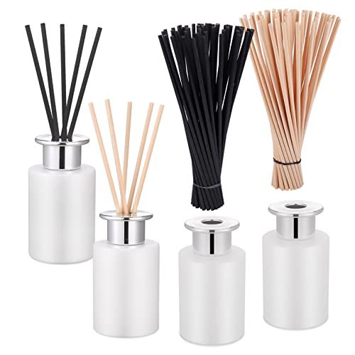 Hejo 4 stuks 100 ml mat wit riet diffuser flessen zilver cover met 100 diffuser sticks (50 stuks beige+50 stuks zwart)