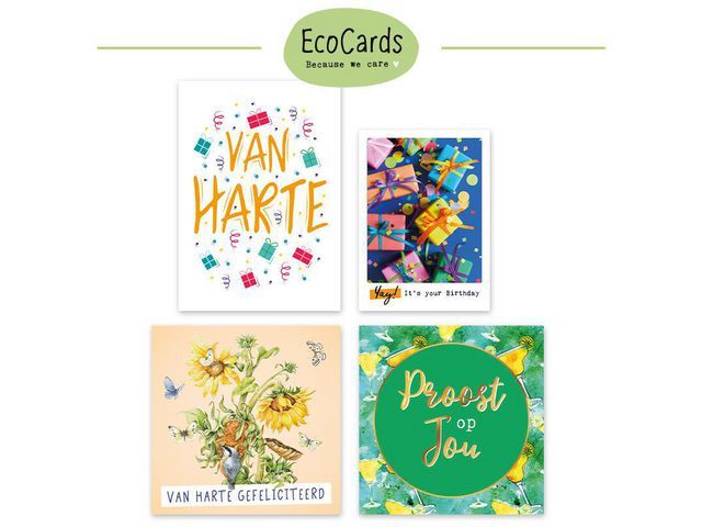Met het sturen van een wenskaart wilt u uiteraard laten weten dat u aan iemand denkt. Bij het sturen van EcoCards wenskaarten doet u dat met een milieubewuste instelling. De kaarten en enveloppen zijn geheel gemaakt van landbouwafval. Bladeren en stengels, die normaal gesproken verbrand worden, zijn hiervoor hergebruikt. Het drukken van de kaarten gebeurt lokaal, waterloos en met gifvrije bio-inkt. Er wordt geen plastic gebruikt bij het verpakken en verzenden van de producten. Dit setje bevat 12 leuke verjaardagskaarten.
