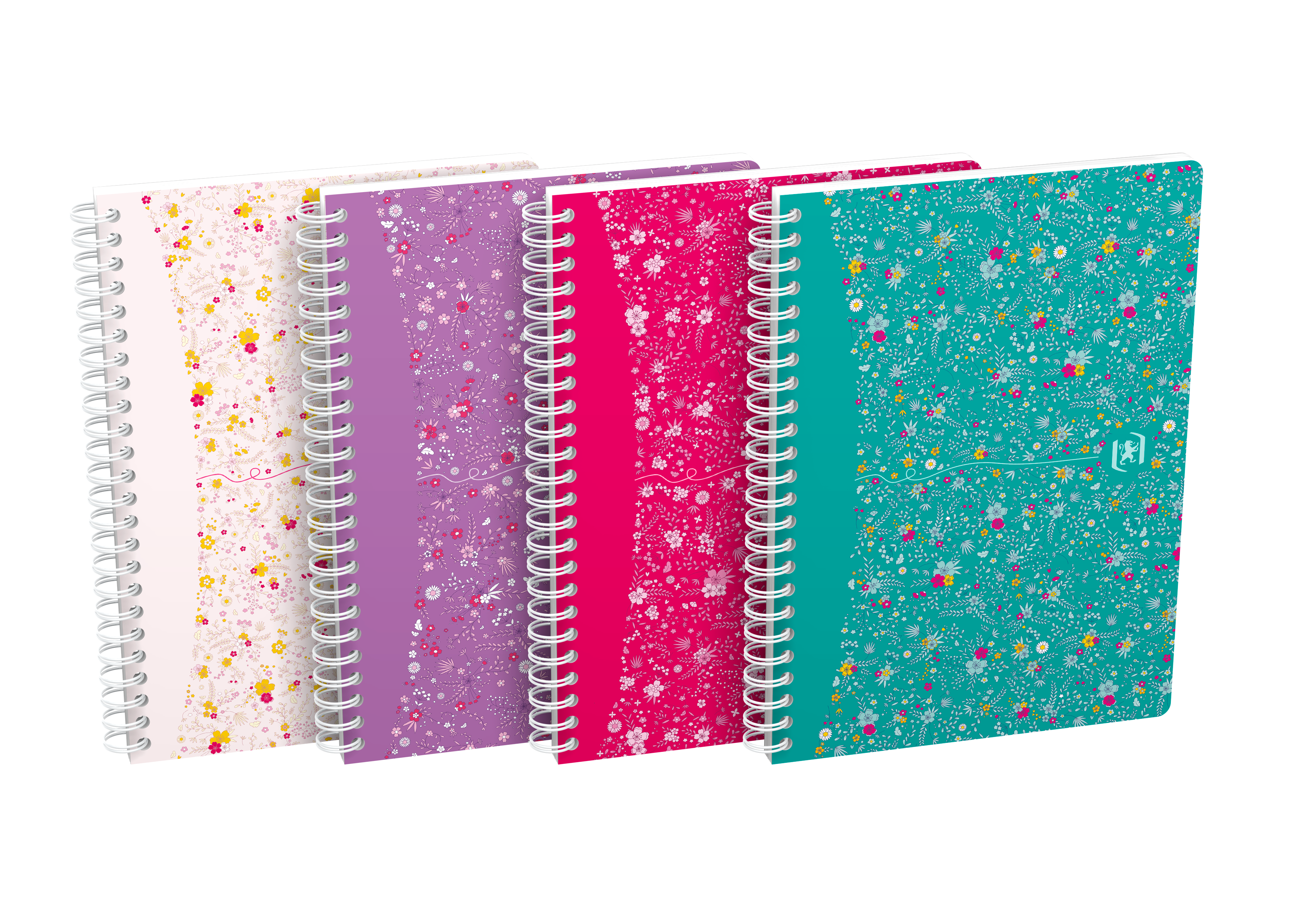 OXFORD Floral spiraalblok A5, gelijnd, 60 vel, 90g, soepele kartonnen kaft, 4 designs assorti, Assorti Ontdek het OXFORD Floral-assortiment, een brede selectie van notitieblokken met bloemmotieven die elke werkruimte tot leven brengen. Floral biedt een combinatie van tijdloze ontwerpen en opvallende kleuren die zeker een statement maken. Heeft u problemen met het kiezen van uw favoriet? Waarom probeert u ze niet alle vier? Deze leuke fleurige composities zijn verkrijgbaar in turquoise, roze, paars of veelkleurig. Het Floral-assortiment is geschikt voor professioneel en persoonlijk gebruik en bestaat uit notitieboekjes voor vergadernotities of algemene organisatie, evenals boeken en blokken in kleine formaten voor aantekeningen onderweg. Alle producten hebben een unieke 'soft touch'-afwerking die een onverwacht fluweelachtig gevoel aan de kaft geeft. A5 spiraalblok, gelijnd met kantlijn, 60 vel. Met Optik Paper®; laat geen