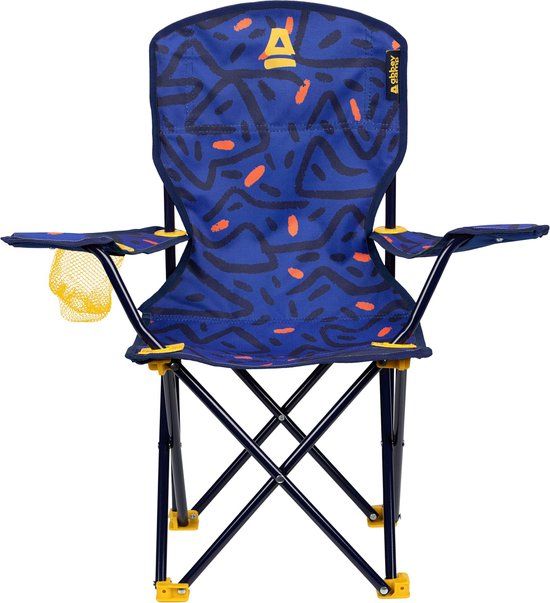 De opvouwbare stoel is gemaakt op basis van een sterk stalen frame met daaroverheen een polyester doek die makkelijk schoongemaakt kan worden. De kinderstoel heeft extra brede doppen op de stoelpoten voor extra stabiliteit en tevens een handige bekerhouder. In het frame zit een veiligheidspal zodat de stoel tijdens gebruik niet zo maar in kan klappen. Eenmaal ingeklapt is de stoel zo compact dat deze gemakkelijk kan worden meegenomen in zijn eigen polyester draagtas. Lol rondom het kampvuur met je eigen kampeerstoel!