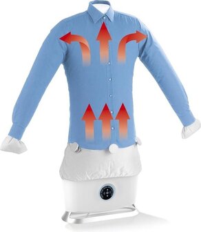 De meegeleverde broekopzet maakt zelfs broeken kreukvrij. Gewoon een gecentrifugeerd overhemd of broek over de strijker trekken, gelijkmatig vastzetten met de 5 gewichtsklemmen, het apparaat inschakelen en de timer activeren. Zo wordt bijvoorbeeld een shirt veel zachter gedroogd en perfect gladgestreken dan in een droger.
