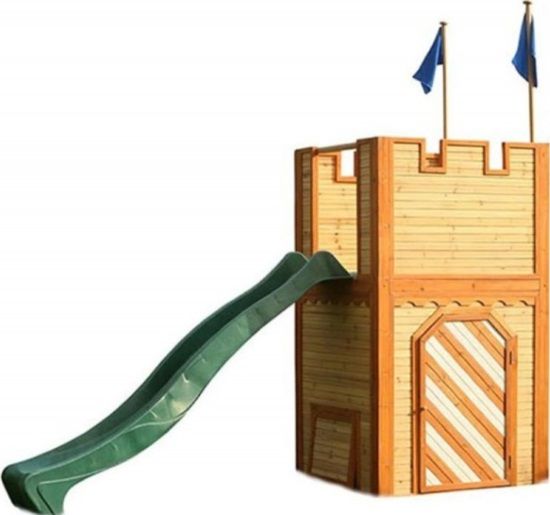 Houten speelkasteel voor stoere ridders en mooie prinsessen. Ridders, verdedig je kasteel en laat de gevangenen niet ontsnappen via het geheime luik! De prinsessen staan op de uitkijk en houden alles goed in de gaten. Met de spannende glijbaan zoeven ze snel weer naar beneden.\n\nSpecificaties houten speelhuisje Arthur- 306 x 110 x 195 cm- Cederhouten planken van 15 mm- Framewerk van 38 mm - 100% FSC houtsoort- Aziatisch cederhout, genaamd Cunninghemia lanceolata.\n\n- 2 lange, smalle transparante ramen (achter de trap)\n- 1 groot transparant raam (zijkant)\n- 1 grote deur\n- 2 kleine klapdeurtjes