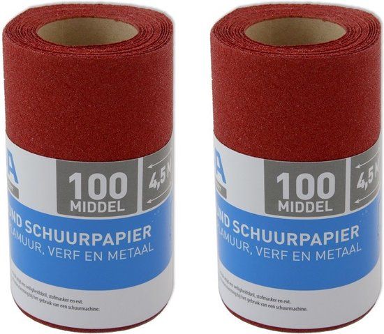 2x Schuurpapier op rol P100 110mm x 4,5 meter. Deze rollen schuurpapier zijn te gebruiken bij nat en droog schuren. Het papier kan gebruikt worden voor o.a. staal, aluminium, hout, verf en plamuur. Grofheid: P100. Maat: 110mm x 4,5 meter. Verf/klus materiaal benodigdheden.