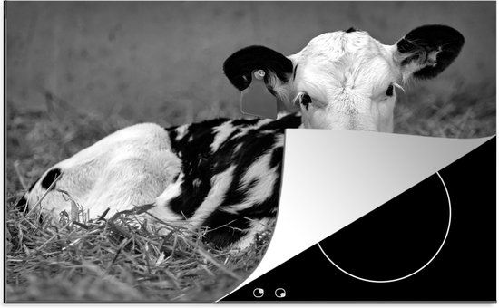 Inductie mat - Schattig kalfje van een Friese koe ligt in het stro - zwart wit - Inductie afdekplaat - Keuken