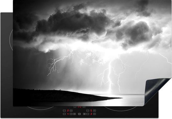 KitchenYeah® Inductie beschermer 77x51 cm - Bliksem boven de zee - zwart wit - Inductiebeschermer voor kookplaat - Kookplaten