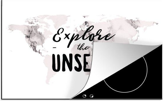 Wereldkaart met de quote 'Explore the unseen' op wit marmer. Het marmer is dooraderd met grijs..Reviews