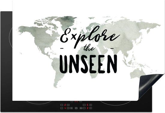 Wereldkaart quote 'Explore the unseen' op een wit gekleurde achtergrond. De wereld zelf is gemaakt met grijs gekleurde waterverf..