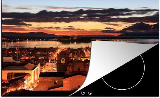 De zon gaat onder achter de verlichte stad Puno in Peru aan het Titicacameer..Reviews
