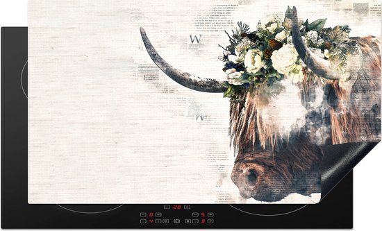 Inductie mat - Schotse Hooglander - Bloemen - Krantenpapier - Inductie afdekplaat - Keuken