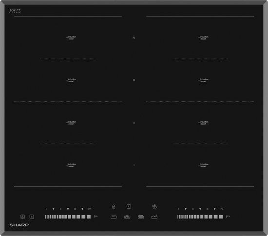 De Sharp KH6I46CS00EU is een inbouw inductiekookplaat met 8-kookzones welke aangesloten dient te worden op een 5-polig perilex stopcontact (2-fasen). De glasplaat van de KH6I46CS00EU is gemaakt van extra gehard keramisch glas welke rondom facet geslepen is.