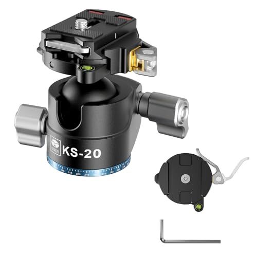 Tête sphérique à faible gravité : la tête de trépied en aluminium robuste adopte une boule de 33 mm de diamètre. Le grand diamètre de la base de 46 mm augmente la surface de contact avec le trépied, le design à faible gravité réduit la distance entre le centre de gravité et la base, ce qui offre une meilleure stabilité et une plus grande capacité de charge pour prendre en charge les appareils photo reflex numériques, les appareils photo sans miroir, les caméscopes et autres équipements pesant jusqu'à 18 kg. Base panoramique à 360° : la tête du trépied offre un fonctionnement fluide pour un panoramique à 360 °. Avec des repères gravés, il vous aide à savoir où vous êtes à chaque fois que vous voulez faire un panorama manuel avec votre appareil photo. Le design encoche en forme de U de la tête sphérique à profil bas peut facilement passer de la prise de vue horizontale à la prise de vue verticale. Libération et installation en quelques secondes : le chargement latéral de la plaque QR de type Arca peut rendre la fixation et le détachement de l'équipement sans effort. Grâce à la clé de verrouillage et au bouton de déverrouillage, vous pouvez installer ou libérer l'équipement en quelques secondes. (En raison des variations dans les spécifications entre les plaques à dégagement rapide de type Arca de différents fabricants, nous vous recommandons d'utiliser la plaque à dégagement rapide fournie dans notre kit pour une compatibilité optimale). Bouton d'amortissement pour balle : le bouton de réglage de la mémoire aide à contrôler la friction de la balle en fonction du poids de charge. Avec un bon amortissement, il est pratique pour une composition précise et un ajustement facile de l'équipement lourd. 【Grande compatibilité】 Cette tête sphérique est livrée avec une plaque de dégagement rapide à vis de 6,35 mm - 20 et dispose d'un trou de filetage interne de 0,95 cm à 16 mm au fond. En outre, il comprend un adaptateur de filetage de 3/8" à 1/4" dans le colis. Cette polyvalence rend la tête sphérique ARCA compatible avec la plupart des appareils photo reflex numériques, caméscopes, jumelles robustes, trépieds, monopodes, curseurs d'appareil photo, et plus encore.