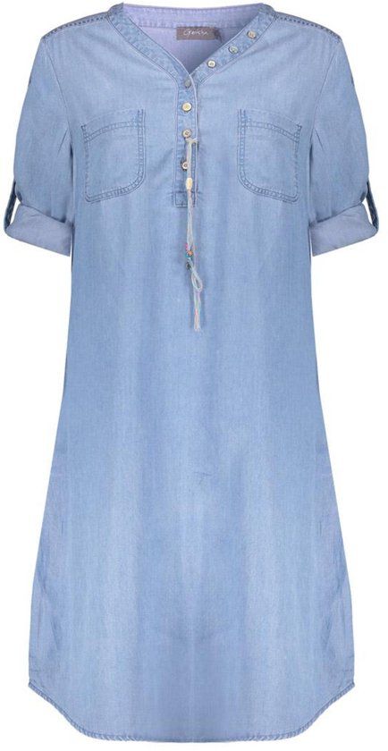 Geisha dames spijker jurk Jet. Model Jet in de kleur bleached denim. De jeans jurk heeft een flatterende V-hals en een knoopsluiting aan de voorzijde. De korte mouwen zijn oprolbaar, wat een speels en veelzijdig effect geeft.