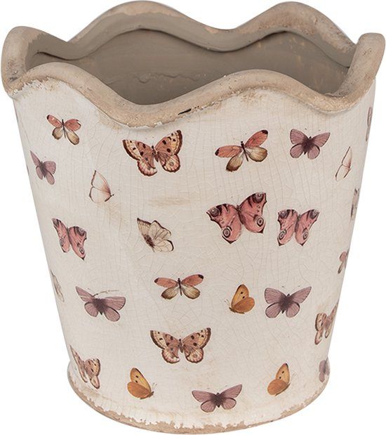 Clayre & Eef Bloempot - Ø 19x18 cm - Beige Roze - Keramiek - Vlinders - Binnen - Kunstplanten