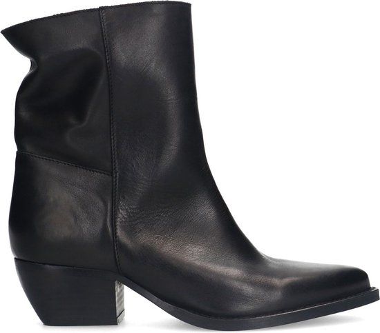 Zwarte leren enkellaarsjes met hak van Sacha. De laarsjes met hak hebben een puntige neus en een blokhak met een hoogte van 5 cm. De boots hebben een schachthoogte van 17 cm en een schachtomtrek van 32 cm. De buiten- en binnenzijde zijn gemaakt van leer. Verzorg de enkelboots met de Collonil clean & care 200ml.