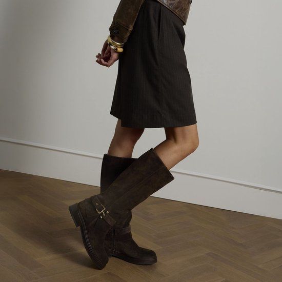 Donkerbruine suède hoge laarzen van Manfield met gesp detail rondom de enkel, ritssluiting aan de binnenzijde en bruine platte hak van 3 cm. De laarzen hebben een schachthoogte van 40 cm en een schachtbreedte van 39 cm, gemeten bij een maat 37. We adviseren als verzorging en bescherming de suède/nubuck spray in transparant.