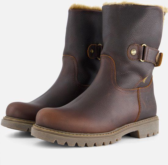 Bruine Panama Jack Felia B42 laarzen, gemaakt van leer. De laarzen hebben een voering en binnenzool van imitatiebont. Hierdoor zijn de laarzen heerlijk warm en comfortabel om op te lopen. Ter decoratie zijn er stiksels en merkopdrukken aangebracht. De boots worden met een klittenbandsluiting vastgemaakt. De rubberen profielzool is slipvrij en heeft een dikte van 3 centimeter. De binnenzool van de Panama Jack Felia laarzen is uitneembaar!