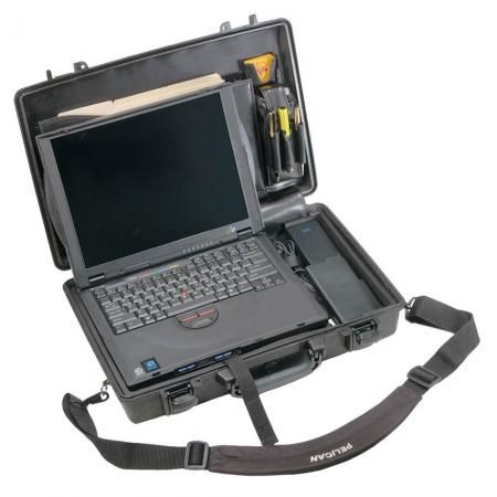 - Watertight, crushproof, and dust proof\n- Open cell core with solid wall design - strong, light weight\n- O-ring seal\n- Automatic pressure equalization valve\n- Stainless steel hardware and padlock protectors\n- Comfortable, rubber over-moulded handle\n- Personalized nameplate service available\n- Unconditionally guaranteed\n- Fits notebook computers up to 38 cm (15 inches) - max. 35.5 x 27.6 x 6.3 cm\n- Lid organizer, fitted shock absorbing tray, shoulder strap\n- Double safety locking latches with keys