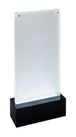 Features\n- for DL (105x210 mm)\n- Product dimensions: 116 x 254 x 46 mm\n- Material: Acrylic\n- Design: clear/black\n- Model: illuminated double-sided presentation, battery-powered\n- 1 pieces\n\nThe LED table-top display frame, "luminous (116x254x46 mm), for DL inserts, is the ideal way to put the spotlight on information and special offers\nConsists of transparent acrylic panels held together by magnets, a glossy black base with integrated LEDs and a switch on the bottom of the base\nPowered by 2 x 1.5 V AA batteries, the versatile table-top display frame has a burn time of approx. 250 hours (batteries not included)\nIdeal for use in catering establishments, hotels, at events and trade fairs, and for production presentations\nExtremely practical: the inserts, which can be viewed from both sides, can be exchanged quickly and easily\n\nThe "luminous" LED table-top display frame will draw your guests' and visitors' attention to your special offers. The lighting in the base is an attractive way to showcase your information. The high-quality, designer display frame for DL inserts consists of a plain black base made of glossy acrylic and two transparent acrylic panels held together by small magnets. The LEDs integrated in the base illuminate the inserts, which can be viewed from both sides, with a modern light similar to daylight. It takes just a few moments to exchange the inserts. The "luminous" table-top display frame is extremely versatile: in catering establishments, hotels, at events and trade fairs, but also for product presentation. It adds a visual element to your information while presenting it elegantly. The practical switch on the bottom of the base activates and deactivates the LED illumination. Flexible and portable, an additional advantage of the "luminous" LED table-top display frame is its burn time of 250 hours.