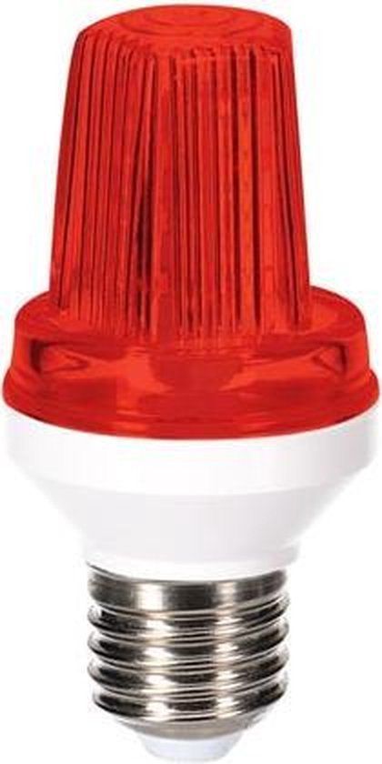 Product specificaties:, Basis productinformatie: - Primaire kleuren: Rood - Extra kleuren: Wit - Diameter: 48 mm - Hoogte van het product: 98 mm - Gewicht Product: 54 g - Materiaal: Polypropyleen , Elektrische gegevens: - Lampvoet: E27 , Technische gegevens: - Vermogen: 3 W - Lichtmodus: Knipperen, Stroboscoop - LED type: SMD 2835 - Stralingshoek: 360 ° - Lichtopbrengst: 360 lm - Bedrijfsspanning: 230 V - Kleur van LED's: Rood , Omgevingsgegevens: - IP waarde: IP56 - Plaats van gebruik: Binnen en buiten , Gebruikseigenschappen: - Maximale flitssnelheid per minuut: 40 , Voeding: - Ingangsfrequentie bereik: 50 Hz