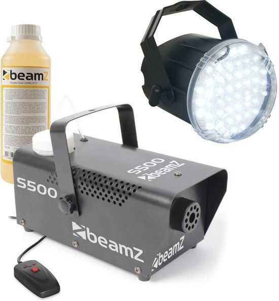Bekijk productBeamZ Rookmachine en stroboscoop - LED stroboscoop + S500 rookmachine 500W met extra 250ml rookvloeistof (500ml totaal) Verrassend effect - LED-verlichting
