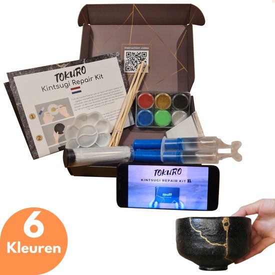 Tokuro Kintsugi Repair Kit XL - Bio Repair Kit - 6 Kleuren: Goud, Zilver, Zwart, Rood, Blauw, Groen - Goudlijm - Keramiek - DIY Kintsugi Kit - Voedselveilig - Vaatwasserbestendig - Lijm voor hobbygebruik