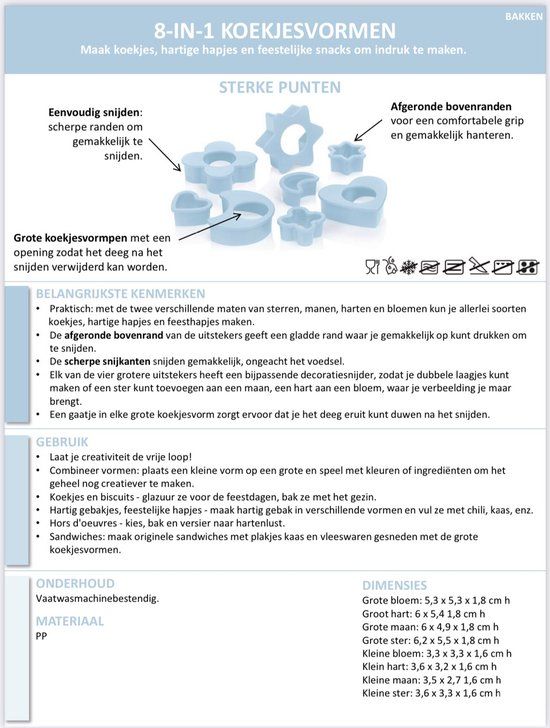 • Praktisch: met de twee verschillende maten van sterren, manen, harten en bloemen kun je allerlei soorten