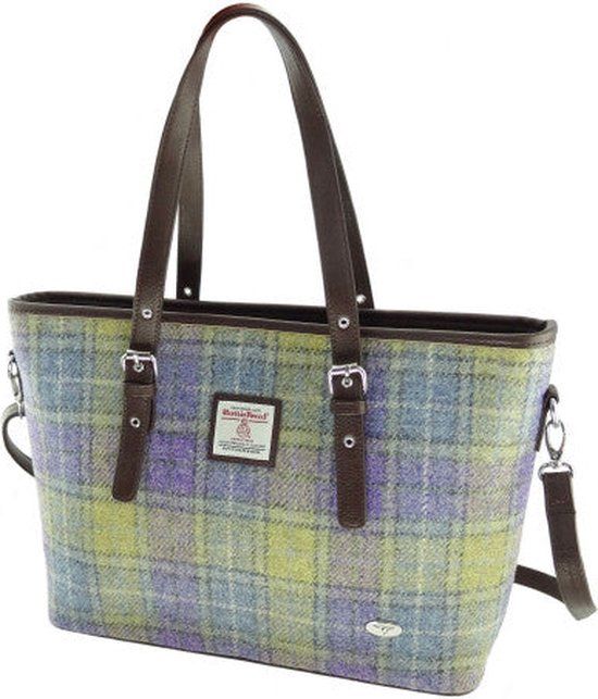 Harris Tweed 'Spey' draagtas. * 100% wollen Harris Tweed buitenkant, polyester voering en PU-rand. * Afmetingen: 30cm x 43cm x 10cm. * Grote schoudertas met ritssluiting en verstelbare hengsels en riem. Band is afneembaar. * Vak met ritssluiting en nog twee vakken aan de binnenkant.