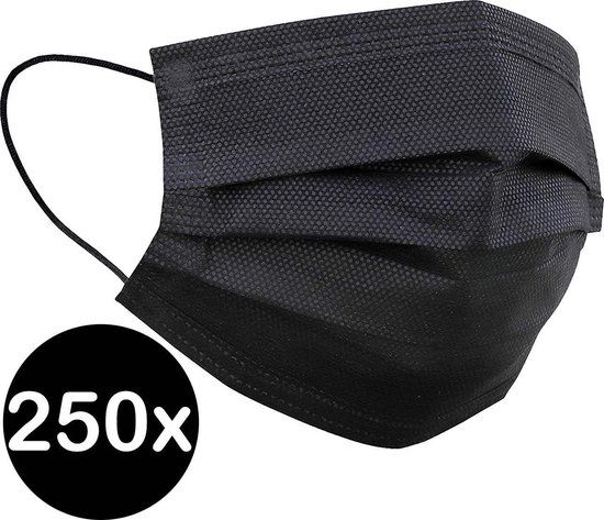 • 250x 3-laags zwarte mondkapjes• Voldoet aan de RIVM richtlijnen