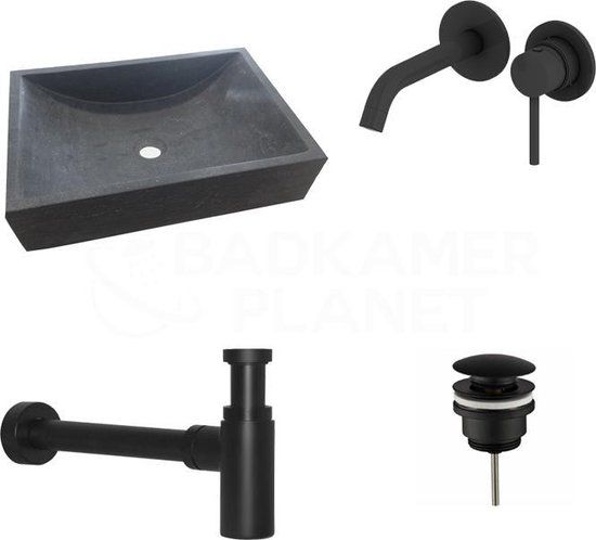 Sani Royal Natuurstenen Waskomset Box Mat Zwart Inbouwkraan 50x35x12 cm - Mengkranen voor gootstenen voor badkamers