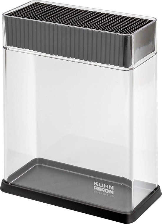Het Kuhn Rikon messenblok is een stijlvolle en praktische manier om je messen veilig te bewaren. Dit messenblok is gemaakt van glas, wat er niet alleen modern en strak uitziet, maar ook een sterke en stevige plek voor je messen biedt. De transparante kleur van het blok laat je de messen duidelijk zien, wat zorgt voor gemak bij het selecteren van het juiste mes. Opvallend is dat dit model zonder vulling komt, je kunt het dus naar eigen wens vullen met je favoriete messen. De introductie van dit model vond plaats in 2022, wat inhoudt dat je met dit messenblok een recent en actueel product in handen hebt. Samengevat biedt het Kuhn Rikon messenblok een mix van design, duurzaamheid en functionaliteit waardoor het een handige toevoeging is voor elke keuken.