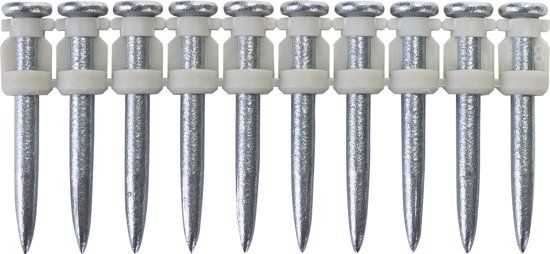 Betonnagels voor het bevestigen van metal stud en hout op beton voorzien van mechanische zink coating. 1 gaspatroon meegeleverd. 10 nagels per strip. Het is ook mogelijk om de nagels op staal te bevestigen. Aanbevolen penetratie diepte per betonklasse: C40/50 13-16 mm C50/60 12-15 mm Aanbevolen penetratie diepte per staalsterkte: 410-450 N/mm2 6,5 mm 500-550 N/mm2 6,5 mm Prijzen zijn aan verandering onderhevig.