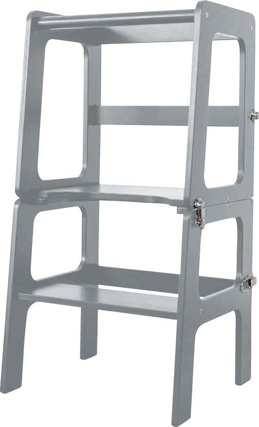 Een leertoren wordt ook wel een kitchen helper genoemd: een keukenhulpje. Dat is het zeker. Kinderen kunnen er eenvoudig zelf op en af klimmen. En zo is niet alleen de leertoren zelf een hulpje voor in de keuken, maar krijg je er ook letterlijk wat extra helpende handjes bij. Gezellig, leerzaam en goed voor de ontwikkeling van kinderen. Daarmee kan het koken met deze stijlvolle grijze leertoren ook echt quality time worden.