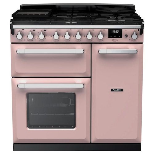Vrijstaand fornuis gas/elektro Estel deluxe 90 met 5 branders waaronder wokbrander, digitale timer, 1 multifunctionele oven met 7 inzetniveaus, 1 heteluchtoven inhoud 67 liter, grill ruimte, thermischebeveiliging en afwerking chrome.